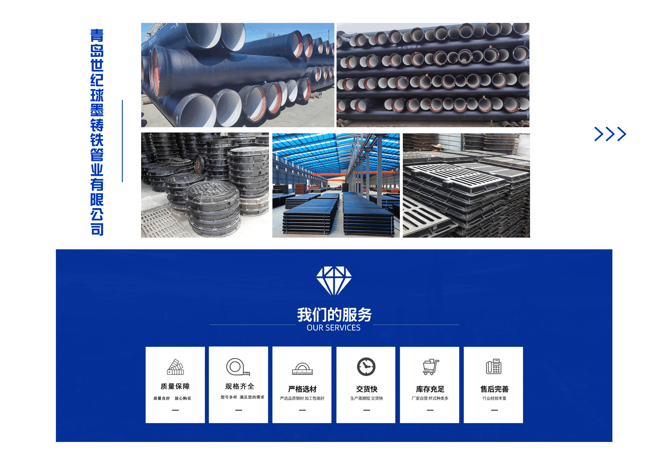 青島世紀(jì)球墨鑄鐵管業(yè)有限公司主營DN80mm~DN2600mm球墨鑄鐵管,給排水球墨鑄鐵管,球墨鑄鐵頂管,自錨式球墨鑄鐵管,球墨鑄鐵保溫管,球墨鑄鐵管件,柔性排水鑄鐵管,球墨鑄鐵井蓋,雨篦子等產(chǎn)品。我公司實力雄厚,常備萬噸庫存,貨源充足,規(guī)格齊全,發(fā)貨速度快!    青島世紀(jì)管業(yè)嚴(yán)格執(zhí)行“精益求精,增強顧客滿意;精益求進(jìn),實現(xiàn)持續(xù)發(fā)展”的質(zhì)量方針,建立起完善的售前咨詢、售中安裝、售后回訪服務(wù)體系,真誠地與用戶建立起長期密切合作關(guān)系。優(yōu)異的產(chǎn)品和良好服務(wù)受到廣大用戶的青睞,是您值得尊敬和信賴的合作伙伴。   青島世紀(jì)球墨鑄鐵管業(yè)始終堅持“誠信立業(yè),追求卓越,合作共贏,共同發(fā)展”,竭誠歡迎各界朋友來廠參觀指導(dǎo),洽談業(yè)務(wù)。我們愿與您攜手共進(jìn),互惠雙贏,共創(chuàng)未來!...